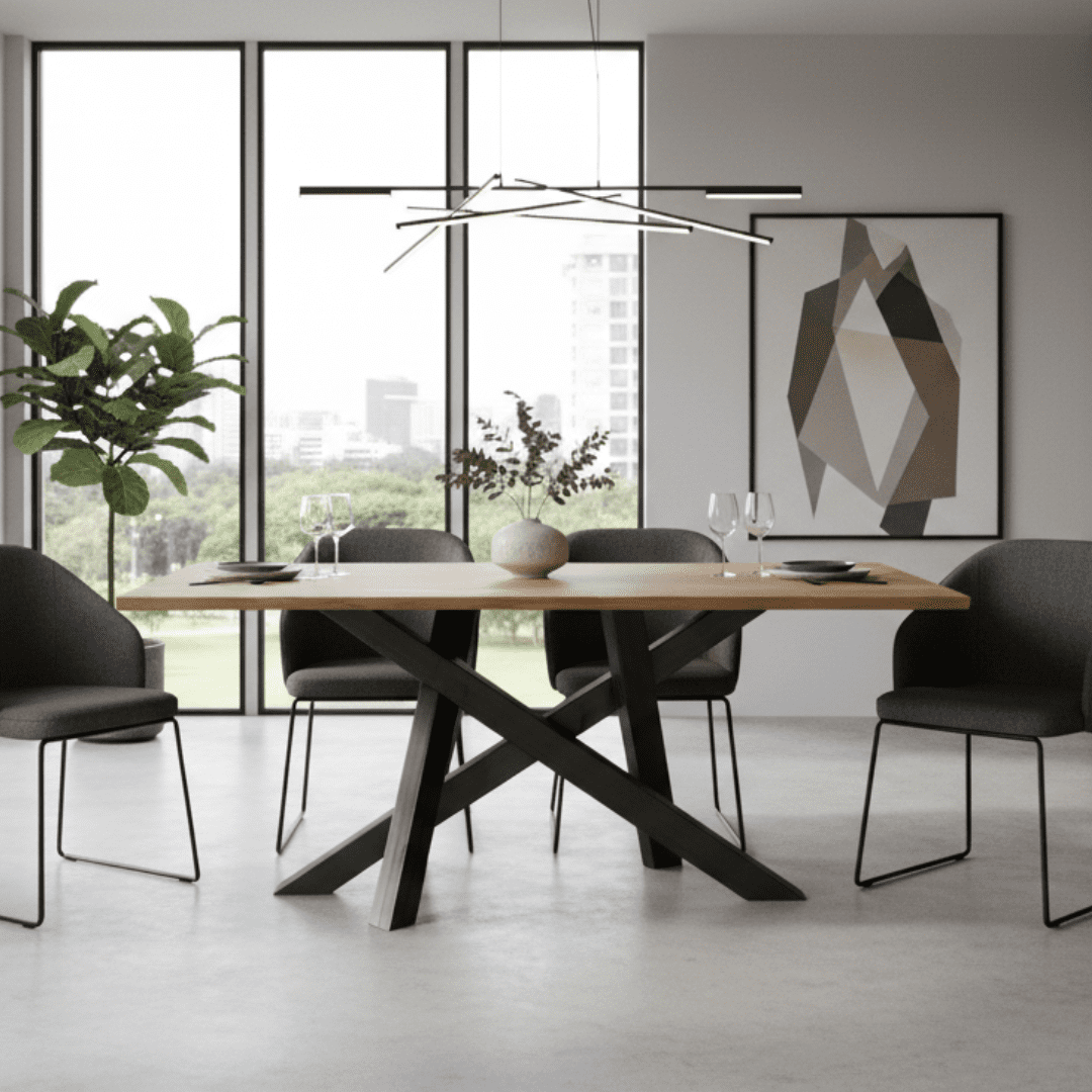 É possível personalizar o tampo de madeira (tipo de madeira, acabamento) e as medidas da mesa, adaptando-a ao seu espaço e à utilização pretendida. Uma mesa robusta e elegante, perfeita para salas de jantar atuais.