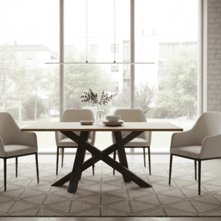 A base é composta por um pé cruzado em ferro preto mate, que garante grande estabilidade e dá um toque moderno e escultural à peça.