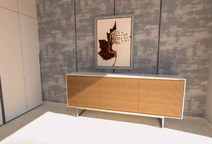 Lacado a branco com ripado em madeira de carvalho e pés em ferro lacado