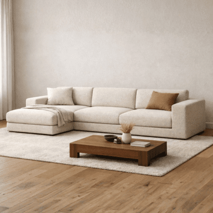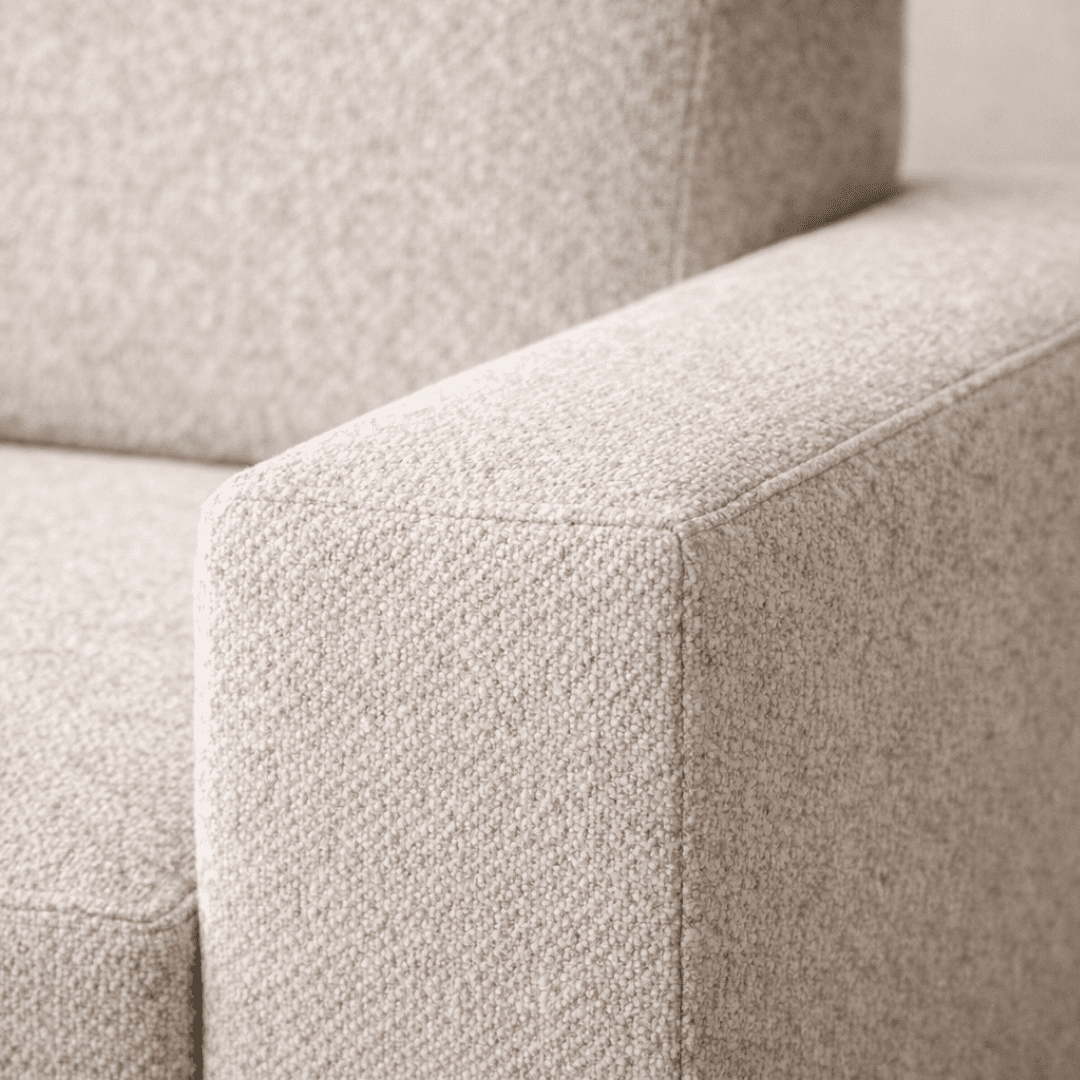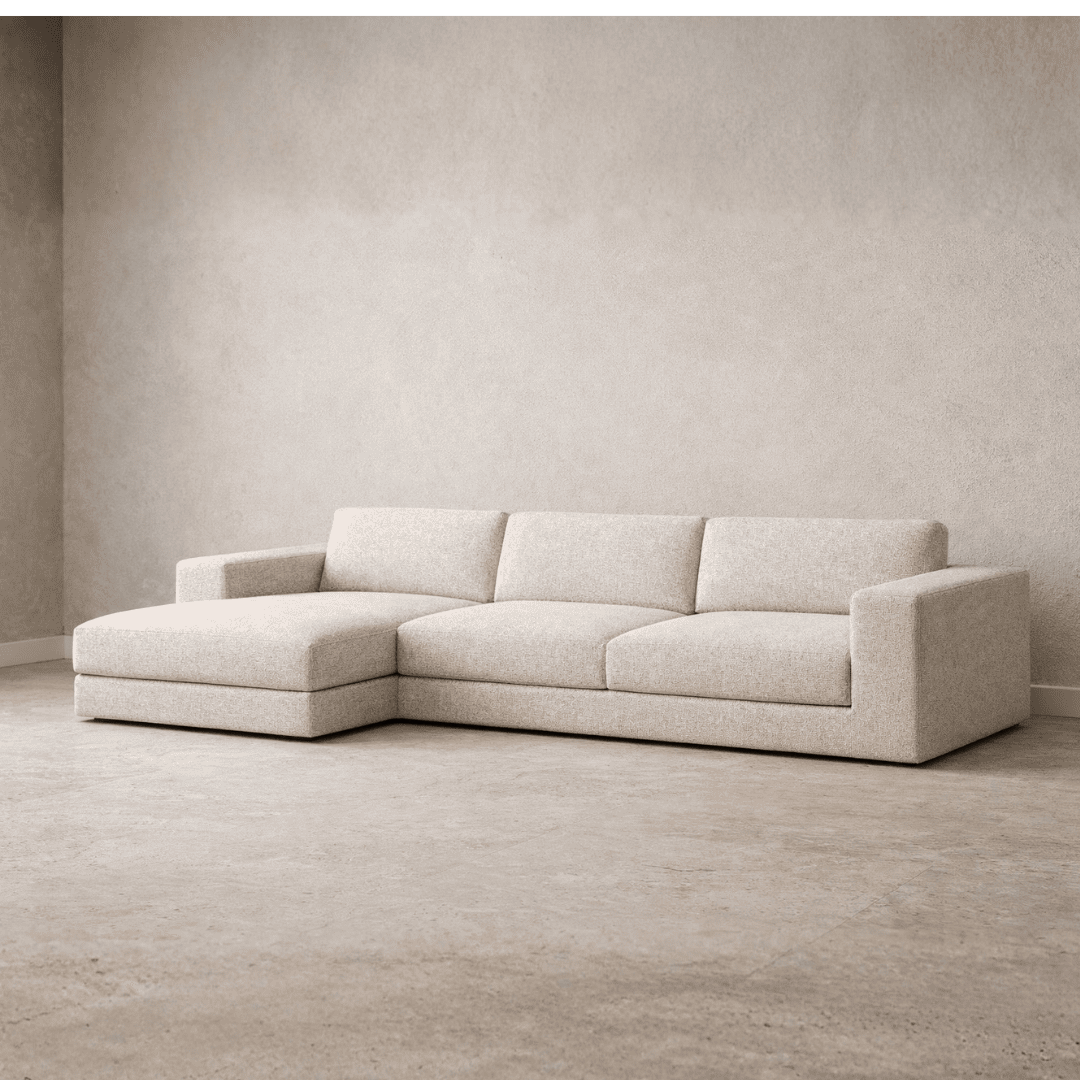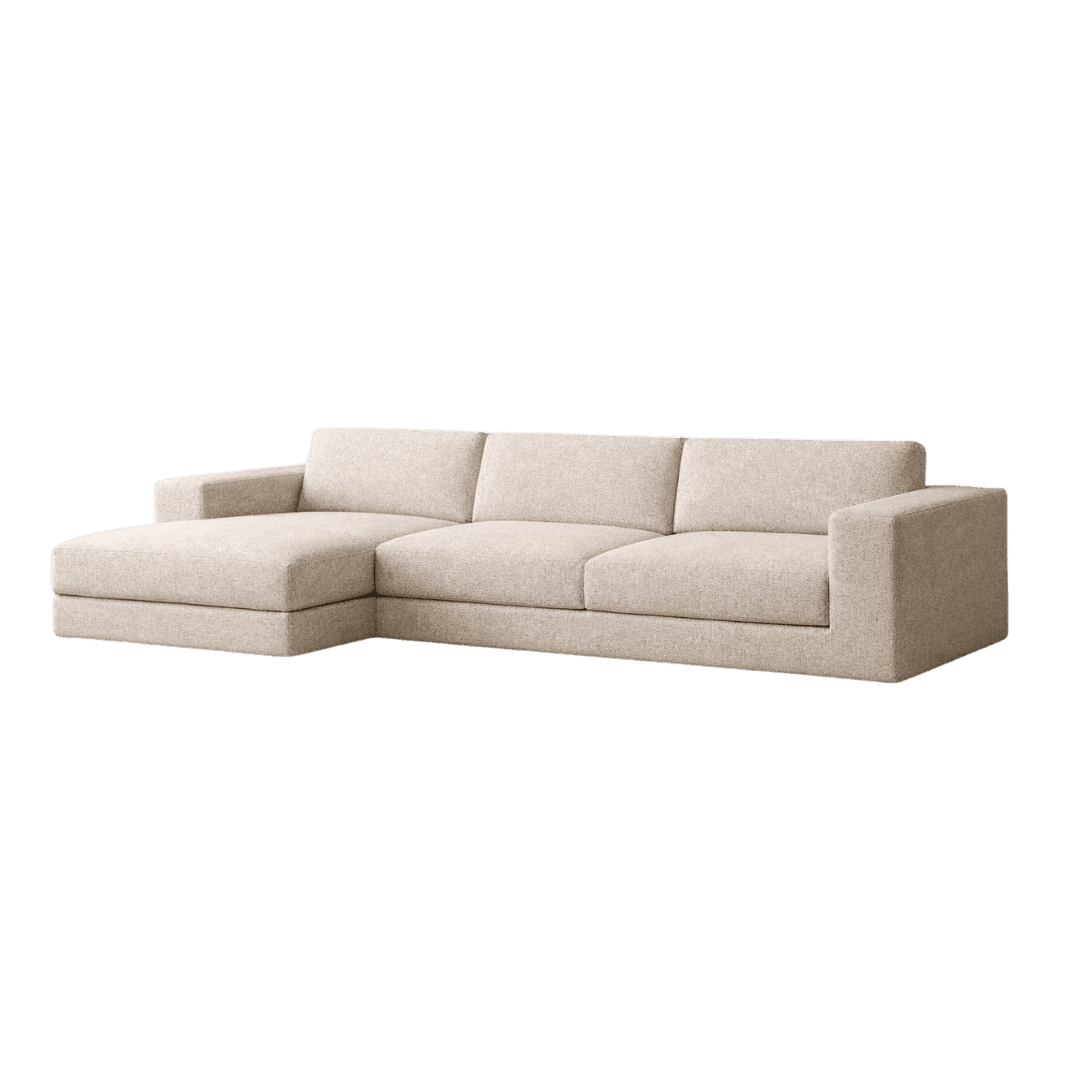 Sofá modular de 3 lugares com chaise longue, de linhas retas e cantos suavemente arredondados, pensado para um visual premium e intemporal.